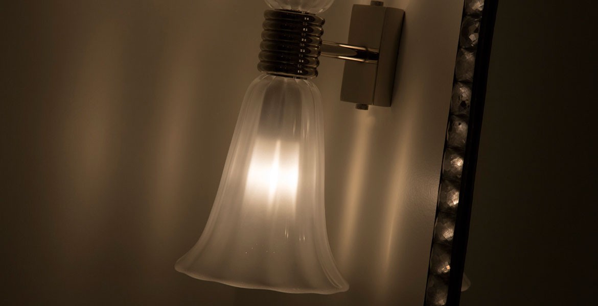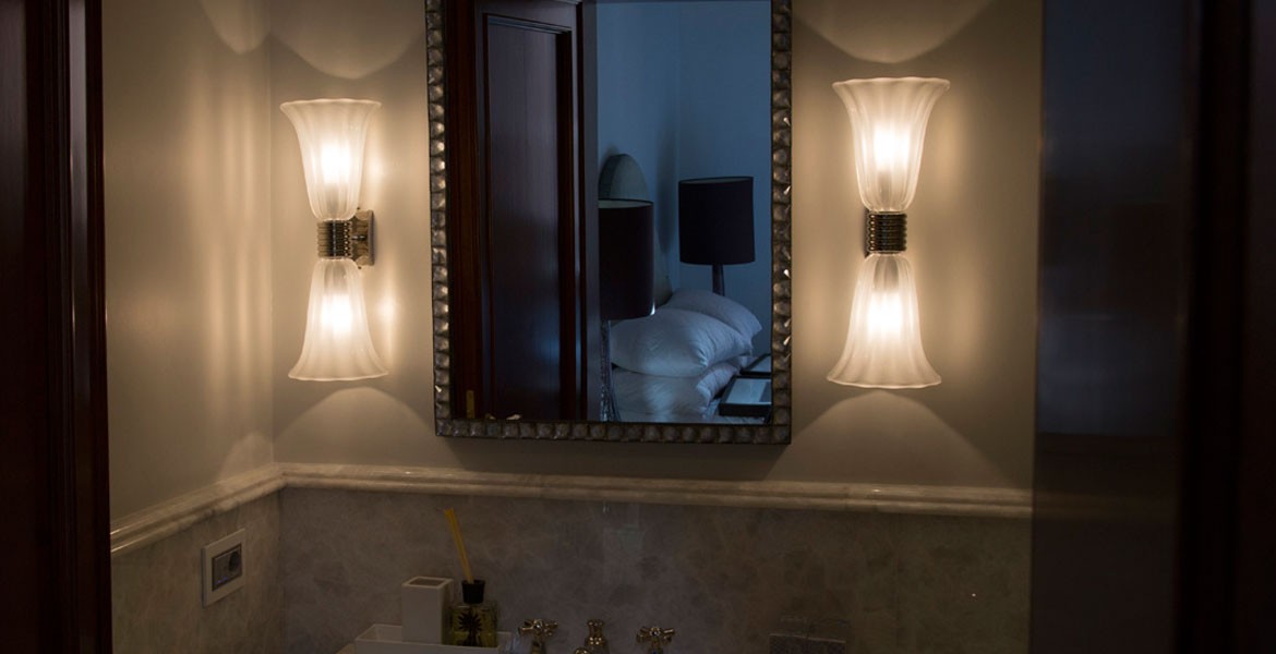 Murano glass sconces designed by Seguso for a bathroom vanity in a private residence.
